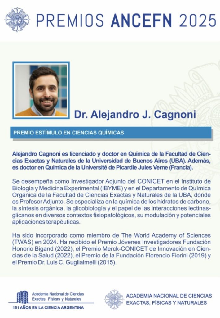 Felicitamos a Alejandro Cagnoni, Profesor Adjunto de nuestro Departamento, por el Premio de la Academia Nacional de Ciencias Exactas, Físicas y Naturales 2023, en la categoría Estímulo. La ceremonia tuvo lugar el pasado viernes 14 de noviembre en el Salón Marechal del Palacio Sarmiento, CABA. La ANCEFN galardona la actividad científica excepcional, con la entrega de los Premios “Consagración” e “Innovación Tecnológica” y desde el año 2006, se otorgan los Premios “Estímulo “para investigadores de hasta 40 años de edad, que desarrollan su trabajo científico o tecnológico en el país. Los premios se basan en la calidad y originalidad de las publicaciones realizadas, las eventuales contribuciones tecnológicas, el liderazgo en una línea de investigación y la dirección de proyectos y becarios. https://www.ancefn.org.ar/contenido.asp?id=3136